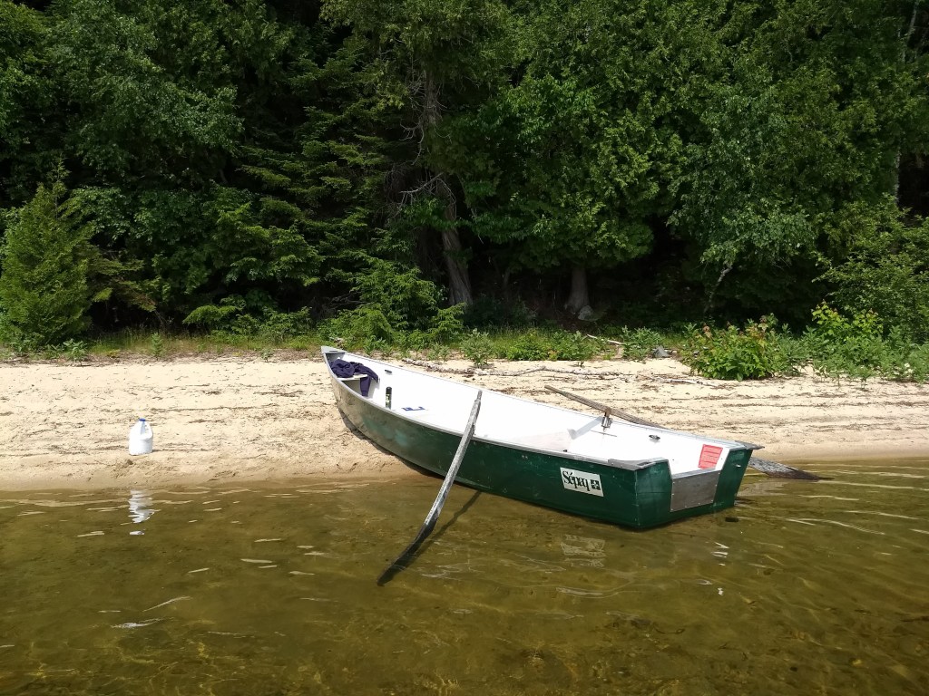 After a couple hours of rowing and the growing burn on my back, we took a break on a small sand beach and went swimming. On our way to the island, we kept seeing a float plane flying around, land on the water, and take off again. The plane ended up getting to the island a bit before us and parking there. Two older guys talked to us for a bit about flying around these lakes. They told us we were paddling the boat backwards, too.