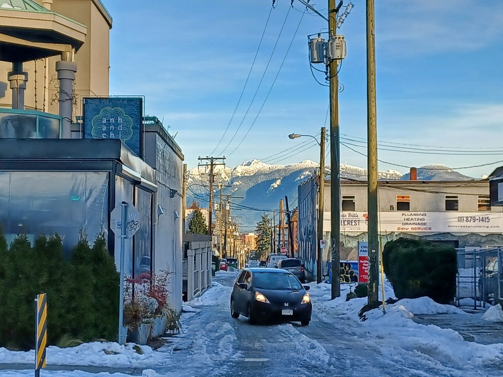 There’s a spot shortly after Main curves a bit to the east on 18th, next to Anh and Chi (rated one of the best bathrooms in Canada apparently), where you can look down an alley for a pretty nice view too. There are other little peeks throughout the neighbourhood as well. If only Main wasn’t so busy it would be more enjoyable, but at the same time there’s something special about walking home from errands with the view staring you in the face amidst all the other people around you going to expensive thrift stores and donut shops.